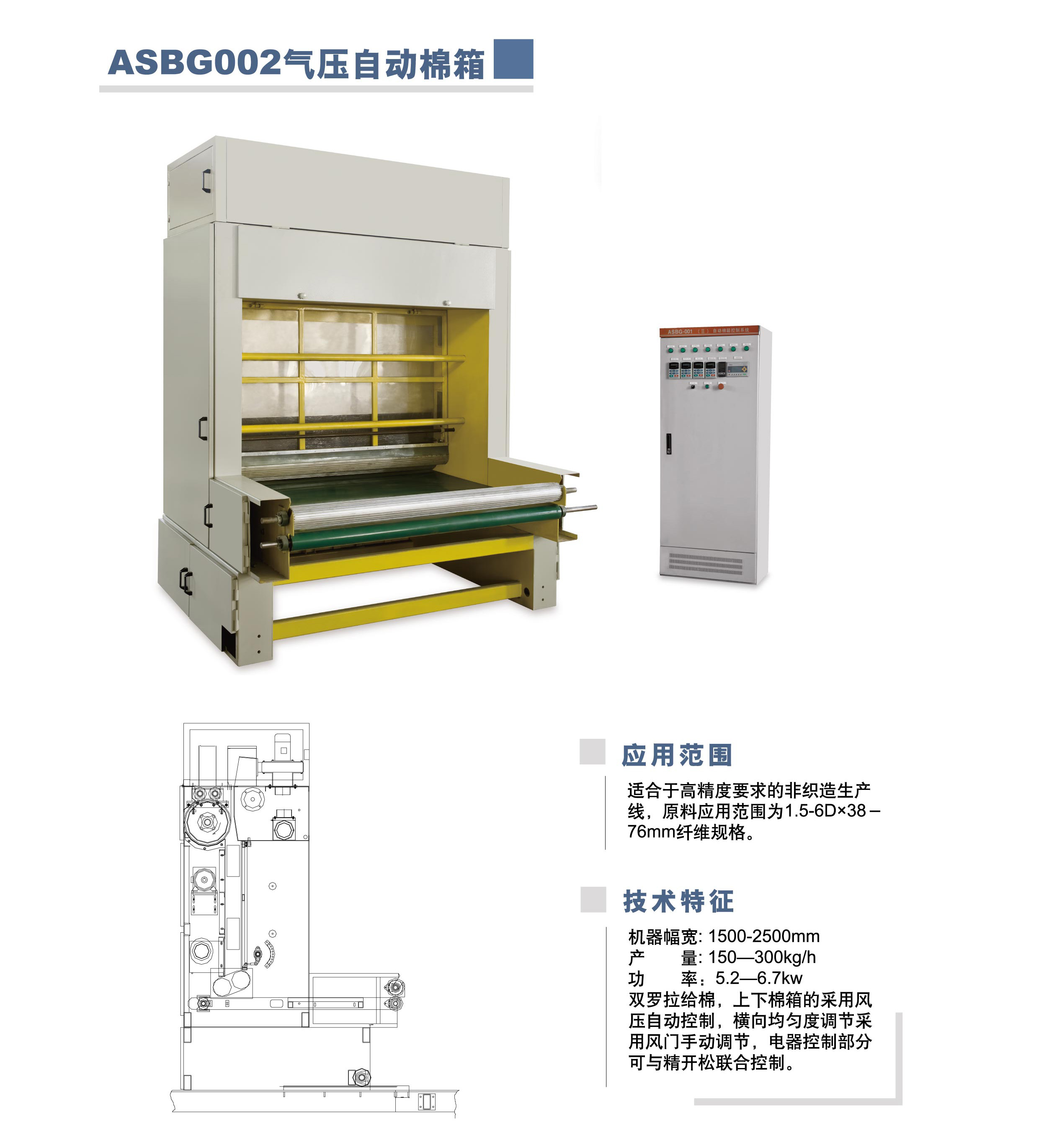 本機(jī)是國內(nèi)較先進(jìn)的喂棉機(jī)構(gòu),置于開松機(jī)的后面,借輸棉風(fēng)機(jī)的作用,將充分開松的纖維均勻充填到本機(jī)上棉箱,有壓力傳感器控制上棉箱的棉位。