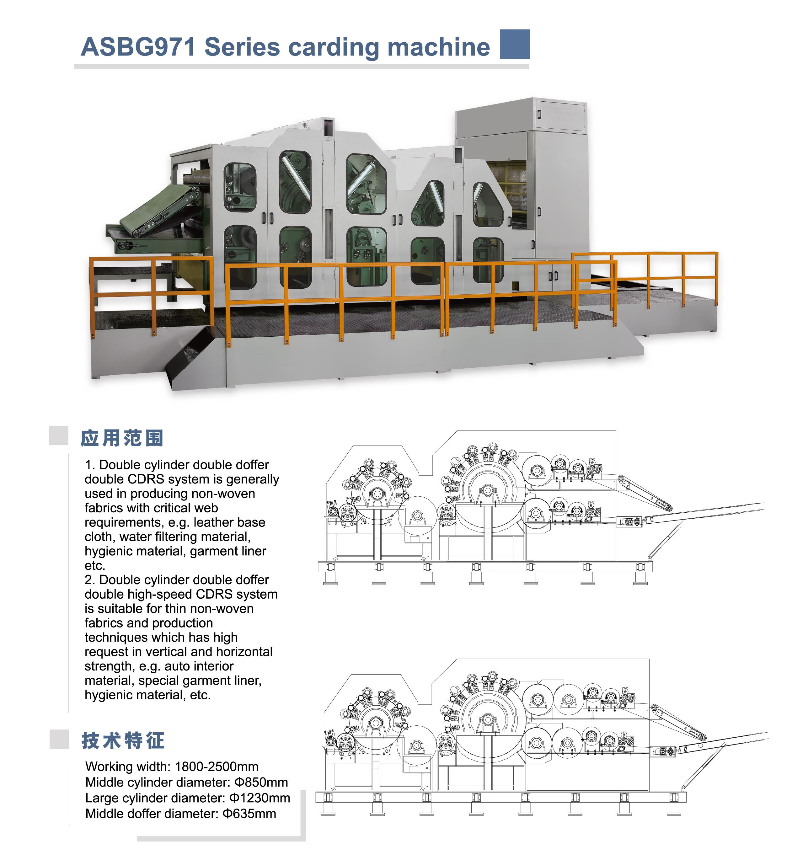 該機(jī)是非織造生產(chǎn)線中的主要單元機(jī),特別適用于高檔線中用以對充分開松處理的纖維(包括滌綸,黏膠,尼龍,丙綸等多種纖維)長度為38mm-70mm,細(xì)度為1.5D-6D的化纖及混紡原料通過充分梳理后成為均勻分布的纖維網(wǎng),供下道工序使用。
